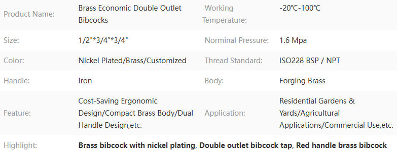 A Brass Economic Double Outlet Bibcock is a compact, cost-effective bibcock designed with two separate outlets. Its core structure is primarily made from forging brass for the main components (body, bonnet, hose connector), ensuring durability and corrosion resistance.