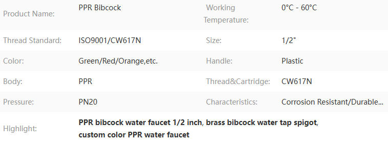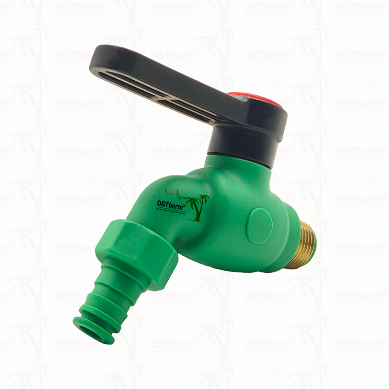 The PPR Bibcock is a terminal water outlet valve designed for PPR piping systems. It features a PPR body for corrosion-resistant, leak-free thermal fusion connections and incorporates brass components (CW617N) for the faucet cartridge and male thread, ensuring reliable operation and durable fittings.